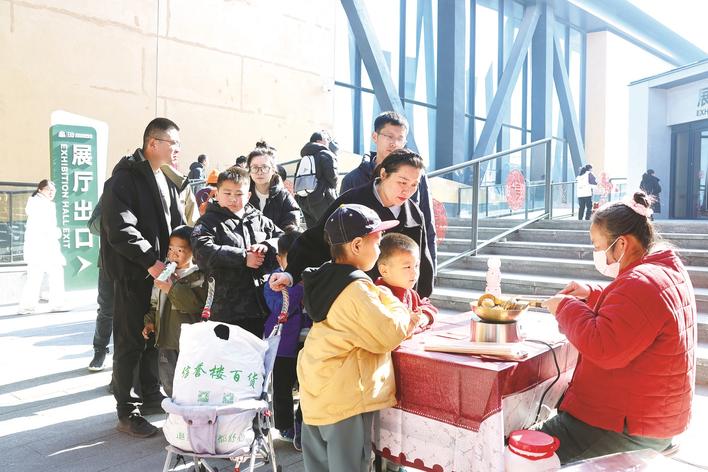 春节期间,中国古动物馆(保定自然博物馆)推出春节限定活动,包括趣味打卡、萌趣闯关、非遗民俗、专业科普,以及特色公益特展,为游客提供打卡、研学、观展一站式新体验。图为游客排队体验手工制作。杨藩 摄