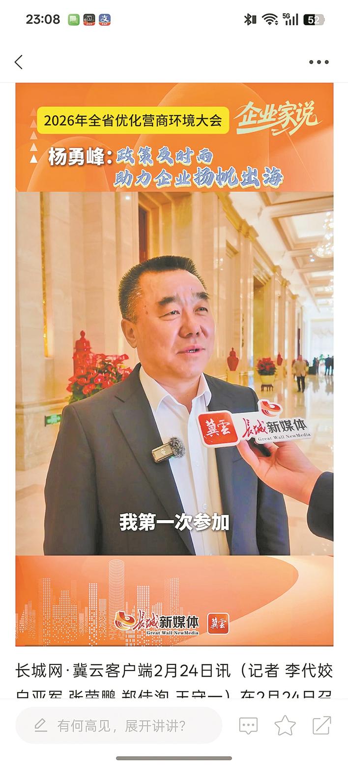 本报讯(记者李代姣 白亚军 张荣鹏 郑佳洵 王守一)在2月24日召开的2026年全省优化营商环境大会上,干货满满的政策举措让与会企业倍感振奋。河北圣昊光电科技有限公司董事长杨勇峰接受采访时说,大会发布的河北省优化营商环境33项措施能够极大激发企业创新创业活力,是助力企业发展的“及时雨”。