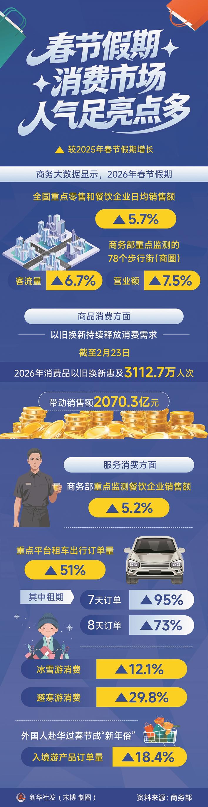 数据显示,春节假期,商务部重点监测的78个步行街(商圈)客流量、营业额较去年春节假期分别增长6.7%和7.5%;商务部重点监测餐饮企业销售额较去年春节假期增长5.2%;重点平台智能眼镜、具身智能机器人销售额较去年春节假期分别增长47.3%和32.7%;全国消费相关行业日均销售收入与上年春节假期相比增长13.7%。
