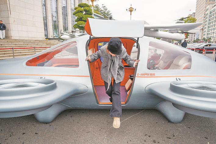 2月24日,参观者从一款eVTOL航空器舱内走出。 2月24日,湖北自主研制的多款eVTOL(电动垂直起降飞行器)航空器以及人形机器人在“全省加快建成中部地区崛起的重要战略支点推进大会”上亮相,集中呈现湖北低空经济、人工智能等产业的最新研发成果。新华社记者 肖艺九 摄