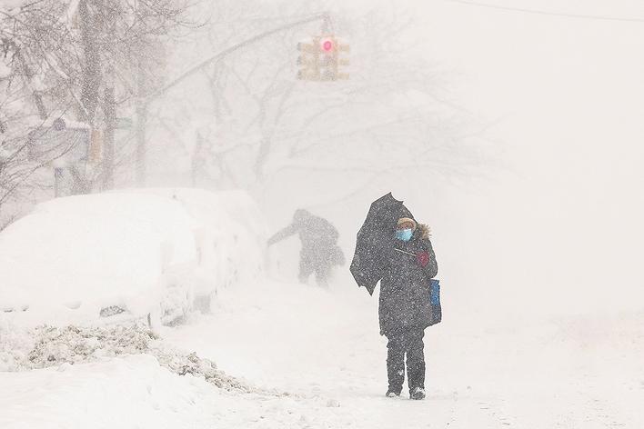2月23日,行人在美国纽约的暴雪中行走。 冬季风暴2月23日继续肆虐美国东北部,当地公共交通和民众出行受到严重影响,截至当天下午,有5600多个航班被取消,超过50万用户遭遇停电。新华社/法新