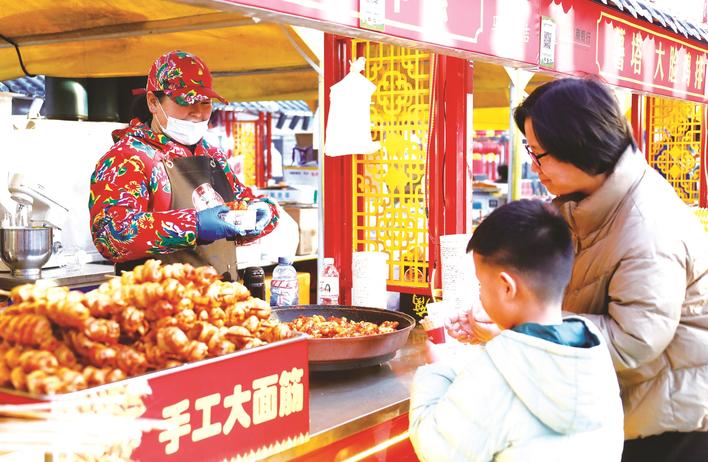 为了促进春节假日消费,固安县政府发放了庙会券、文旅券、商超券和餐饮券,最高补贴20%。消费券采用线上领取、线下使用的便捷模式,即领即用,切实降低了市民游客的消费成本。图为在固安县人民广场,游客购买食品。张琛 摄