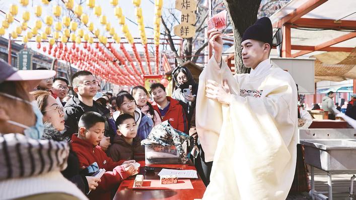 春节期间,位于香河县的国安第一城举办“非遗过大年”系列主题活动,在大明幻境展演常州战鼓、黄漕飞叉、中幡等传统非遗技艺,设置特色新春祈福、年货大集、皇城冰雪嘉年华等活动,构建了“日间有乐、夜间有景、全程有韵”的立体式跨年狂欢体系。图为景区演艺人员与游客互动。倪利明 摄
