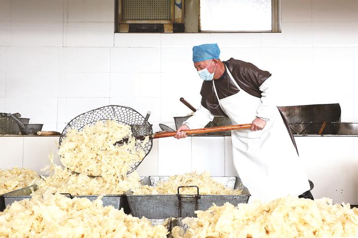 近日,丰润区七树庄镇的传统手工麻糖企业一片忙碌景象,员工们加紧制作麻糖,满足市场需求。图为在丰润区广盛号食品有限公司,员工在车间炸制麻糖。 朱大勇 摄