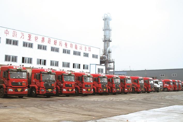 在唐山金利海生物柴油股份有限公司园内,油罐车排列整齐、整装待发。