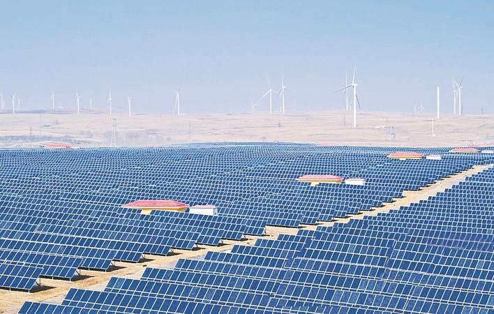 在张北县“国家风光储输示范基地”,一排排光伏板列阵“捕光”。