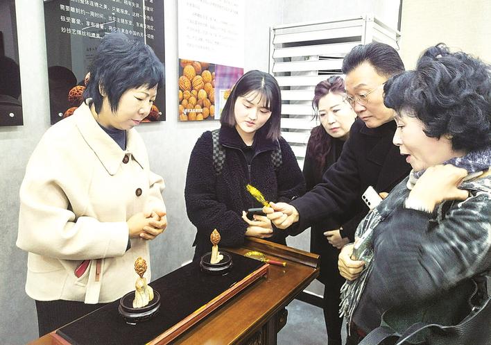 近日,韩国商贸访问团一行来到永清县,双方围绕文旅康养融合发展、非物质文化遗产文创出海、特色产品贸易等方面展开深入交流。图为韩国商贸访问团参观永清核雕工艺品。庞趁友 杜德旺 摄