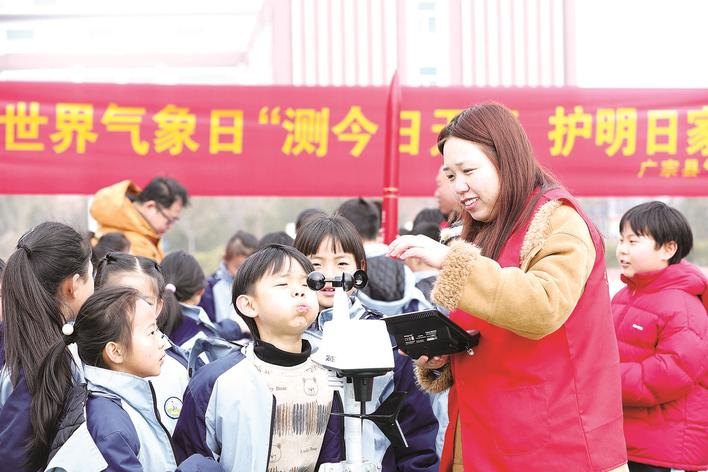 近日,广宗县气象局联合广宗第四小学开展气象科普进校园活动,通过专题讲座、设备展示、科普展板、现场咨询等形式,以“趣味体验+知识传递”模式向学生普及气象知识,提升学生对气象科学的关注与认知,迎接世界气象日的到来。记者 刘杨 通讯员 王垒 摄