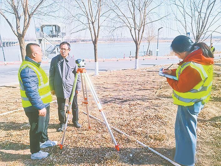 2月11日上午,正定水文站。石家庄水文中心几名技术人员正半蹲在滹沱河岸旁,熟练架起水准仪,对三个基本水准点做交叉校准。镜头推进,目镜里的十字丝稳稳卡准标尺刻度。