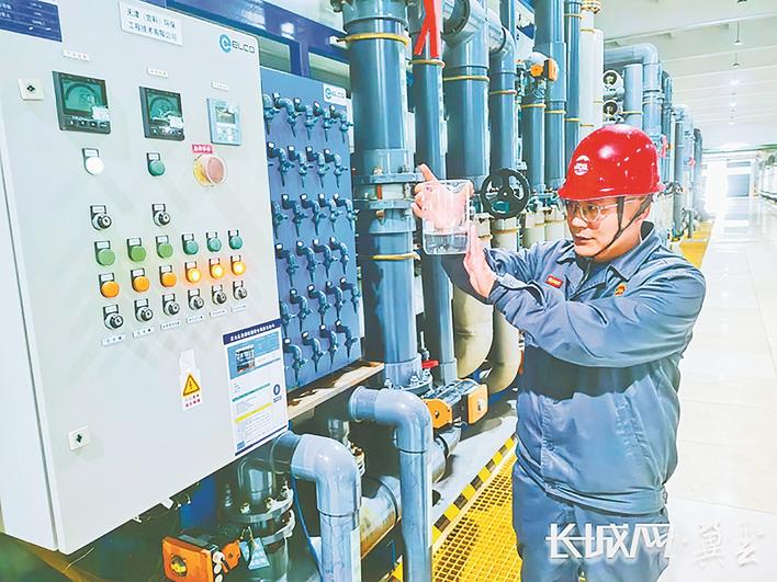 敬业集团动力事业部供水车间工作人员展示污水深度处理后的软水。本报记者 吴新光 摄