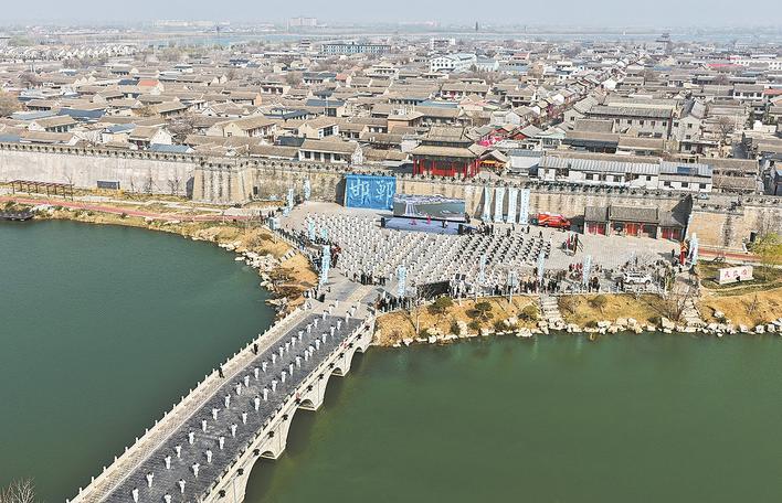 3月21日,太极拳爱好者在邯郸市永年区广府古城进行太极拳展演(无人机照片)。