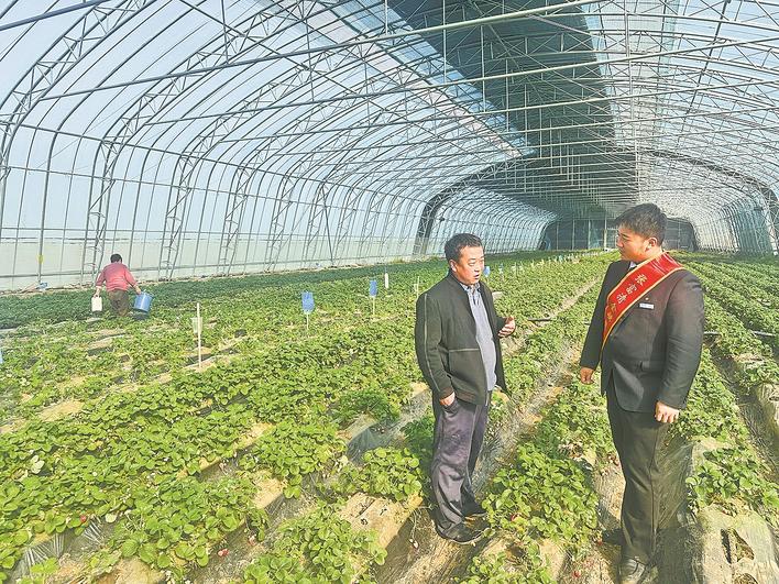 石家庄市正定县红薯产业园以种植草莓、红薯等高效经济作物为核心业务,是河北省重点农业单位。为满足产业园在扩大生产、技术升级等方面的资金需求,近日,建行石家庄正定支行主动对接,为其量身定制并成功办理了30万元“特色产业贷”。图为该行客户经理(右)深入园区大棚,详细了解生产经营情况。 李宪民 李泽桢 摄