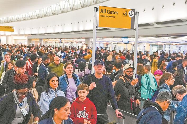 3月23日,旅客在美国纽约的约翰·肯尼迪国际机场排队等候安检。 美国国土安全部定于25日向国会通报,该部门“停摆”导致5万名机场安检人员被迫无薪工作,而国土安全部下属运输安全管理局已有460名工作人员辞职。新华社/美联