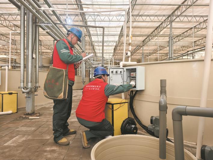 4月1日,河北汇中新健农业发展有限公司海马养殖基地内,承德供电公司工作人员正在检查用电设备。孙婷婷 摄