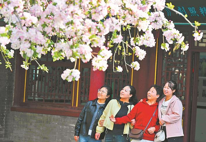 3月29日,游人在石家庄市正定荣国府影视基地内赏花拍照。 春风拂面,繁花盛开。人们踏春赏景,漫步在花海之中,感受春日生机与美好。 新华社发(陈其保摄)