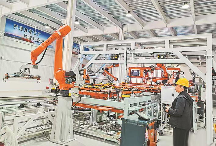 安平县共享智造中试工厂内,技术人员正在操作自动化焊接设备生产护栏网。安平县委宣传部供图