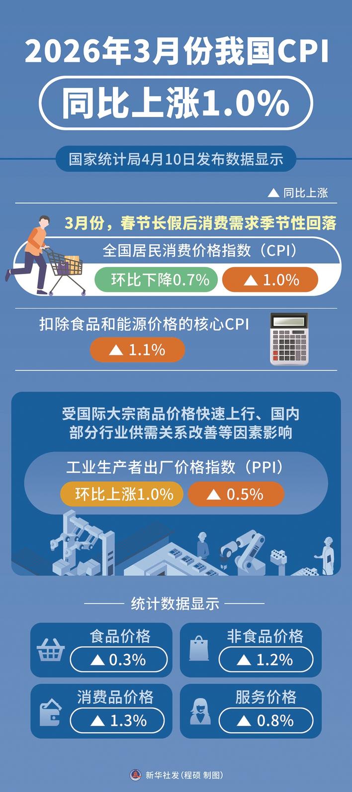国家统计局10日发布的数据显示,3月份全国居民消费价格指数(CPI)同比上涨1.0%,扣除食品和能源价格的核心CPI同比上涨1.1%;一季度CPI比上年同期上涨0.9%。工业生产者出厂价格指数(PPI)同比上涨0.5%,为连续下降41个月后首次上涨。