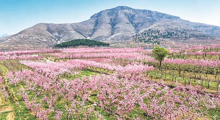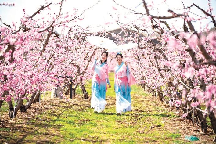 ②阜平县高阜口村的黄桃林迎来盛花期,粉白相间的桃花漫山遍野,文艺爱好者身着亮眼服饰在花间起舞。 李秀芹 摄