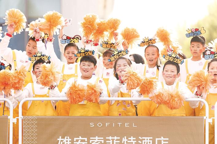 100名雄安新区同龄小使者组成的“雄安之星”加油团。边晨旭 摄