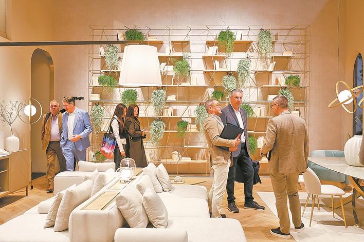4月21日,在意大利米兰国际会展中心,展商在米兰家具展上洽谈。当地时间4月21日,第64届米兰家具展在意大利米兰国际会展中心拉开帷幕。本次展会吸引来自32个国家约1900家参展商及227个品牌参展。同时,由家具展“外展”形成的米兰设计周也在米兰市内各个区域同步进行。新华社记者 李京 摄
