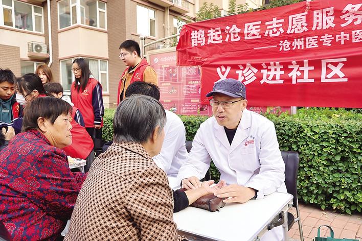 日前,沧州市创城办开展了“义诊进社区 惠民暖冬行”实践活动。沧州医学高等专科学校组织3支师生志愿者队伍,为社区群众开展中医推拿按摩、血压测量、口腔检查等义诊项目。图为工作人员为居民检查身体。杨洋 摄