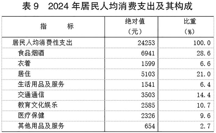 全年居民人均可支配收入34665元,比上年增长5.4%。按常住地分,城镇居民人均可支配收入45610元,增长4.5%;农村居民人均可支配收入22022元,增长6.4%。城乡居民人均可支配收入比值为2.07,比上年缩小0.04。居民人均消费支出24253元,增长5.8%。按常住地分,城镇居民人均消费支出29310元,增长5.0%;农村居民人均消费支出18412元,增长6.8%。居民恩格尔系数为28.6%,比上年下降0.8个百分点。其中,城镇居民恩格尔系数为27.5%,农村居民恩格尔系数为30.6%。