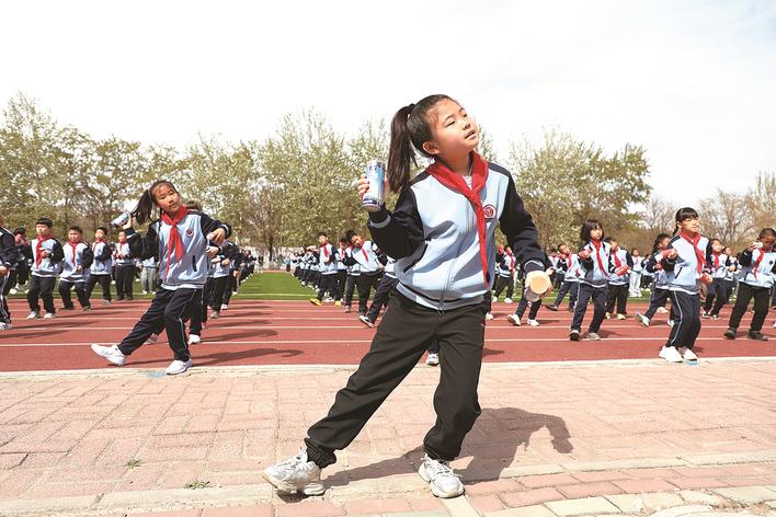 为了丰富学生的课余生活,提高学生的身体素质,促进学生全面发展,开平区育才小学精心策划开展了独具特色的“罐罐操2.0”大课间活动,为校园生活增添了一抹亮丽的色彩。图为全体学生齐跳“罐罐操”。何川 杨可旖 摄