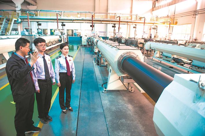 在沧州高新区一家获评A级纳税信用的管道制造企业,税务工作人员了解企业纳税信用助推新产品开发情况。