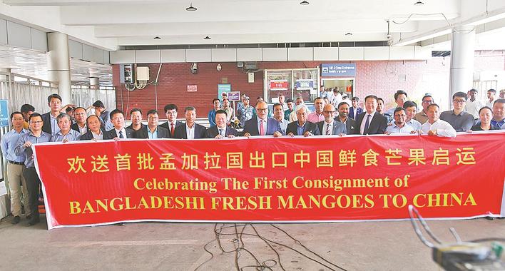 5月28日,在孟加拉国首都达卡,嘉宾出席首批孟加拉国输华芒果启程仪式。这批芒果为孟加拉国地理标志产品,其果肉纯净细腻、糖度高,兼具独特花香与热带果香,计划进入国内电商、超市和生鲜连锁等渠道销售。此前,孟加拉国芒果主要出口中东及欧盟市场,对华出口取得突破后,首年预计可超过100吨。 新华社发(哈比卜·拉赫曼摄)