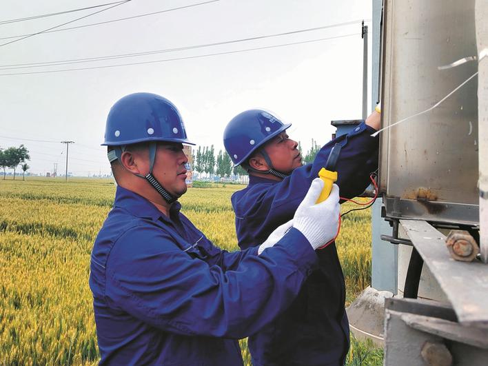 5月26日,巨鹿供电公司官厅供电所工作人员对麦田附近电力设施进行巡视,确保群众麦收期间安全稳定用电。王秀玲 摄