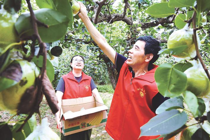 初秋时节,泊头市文庙镇尹庄村大运河贡梨公园内果香四溢,沉甸甸的皇冠梨挂满枝头。近年来,泊头市积极适应市场多元化需求,着力调整鲜梨种植结构,通过引进皇冠梨、秋月梨等新优品种,形成了早、中、晚熟品种合理搭配、错季供应的格局。图为志愿者忙着采摘。张金元 刘辉 摄
