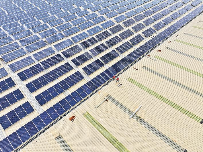 ①国网泊头市供电公司工人在当地一家铸造企业屋顶巡检光伏发电设备。