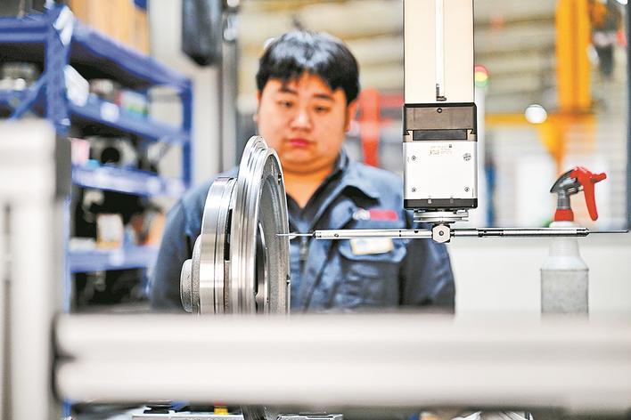 ⑥亚奇铸业有限公司工人在产品检测室内工作。