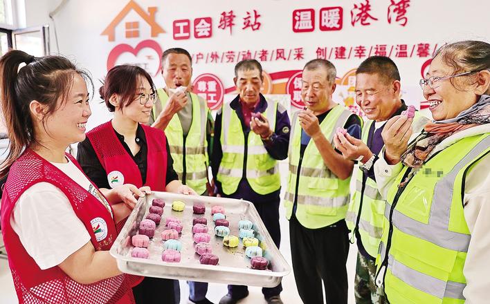 9月26日,海港区河东街道工人北里社区志愿者为环卫工人送上手工月饼。 中秋节来临前,秦皇岛市海港区河东街道工人北里社区开展“中秋送祝福 情暖环卫工人”活动。该活动由社区志愿者为环卫工人送上手工月饼,旨在送上一份节日的关心和祝福。曹建雄 摄