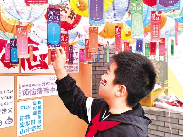 为营造热烈祥和的节日氛围,弘扬中华优秀传统文化,近日,承德医学院网络文明志愿者在承德磬棰湾星光广场开展“喜迎华诞,月满家园”国庆中秋双节同庆志愿服务活动。图为一名学生在猜灯谜。刘璐萌 摄
