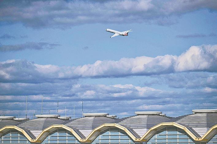 10月8日,一架飞机从美国弗吉尼亚州阿灵顿里根国家机场起飞。 美国政府“停摆”对各方面的影响持续扩大。空中交通管制人员“请病假”加剧人手短缺情况,导致航班延误。航班跟踪网站数据显示,7日全美逾3000架次航班延误。休斯敦、纳什维尔、达拉斯、纽瓦克等地机场均受波及。新华社/法新