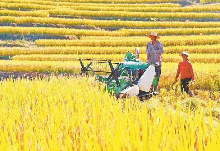 10月10日,湖北省宜昌市秭归县沙镇溪镇长春村村民驾驶农机在田间收获水稻。 据农业农村部最新消息,截至10月10日,全国秋粮收获已过五成。新华社发(王罡摄)