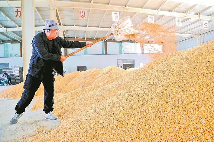 10月10日,在山东省滨州市高新区小营街道一处粮食烘干服务点,工作人员整理烘干后的玉米。新华社发(初宝瑞摄)