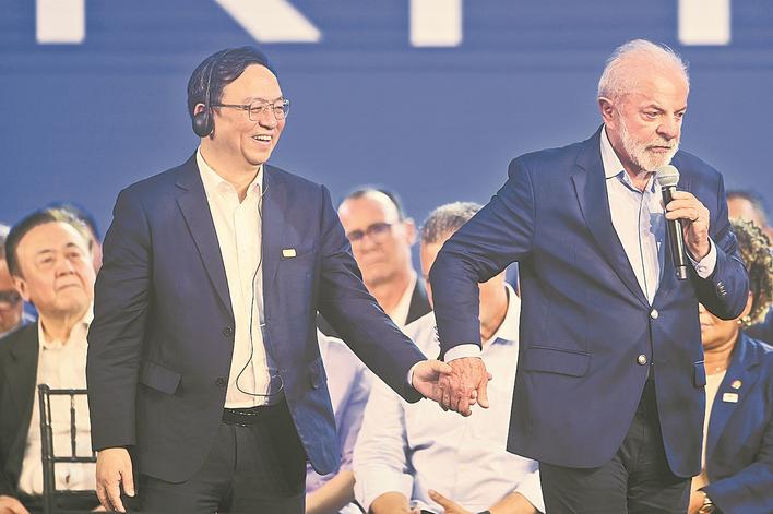 10月9日,巴西总统卢拉(右)在巴西东北部巴伊亚州卡马萨里市出席庆祝仪式时与比亚迪董事长兼总裁王传福(左)互动。 比亚迪第1400万辆新能源汽车9日在巴西东北部巴伊亚州卡马萨里市比亚迪巴西乘用车工厂正式下线。巴西总统卢拉参加仪式并致辞表示,比亚迪选择到巴西投资,让卡马萨里和巴伊亚州人民感到骄傲。“巴伊亚州人民将创造历史,制造出世界上最精密、最快速的汽车。这份荣光将属于巴伊亚,属于中国,也属于巴西。” 新华社发(卢西奥·塔沃拉摄)