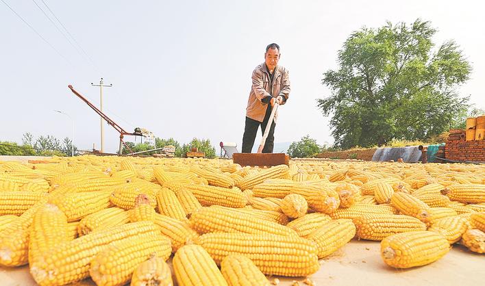 10月15日,井陉县秀林镇南横口村村民在场院晾晒玉米。 金秋时节,各地农民抢抓农时有序开展秋收作业,田间地头一片忙碌景象。 新华社发(梁子栋 摄)