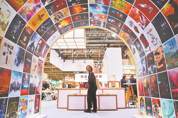 10月15日,一名读者在德国法兰克福书展中国联合展台参观。 第77届法兰克福书展14日晚在德国法兰克福会展中心开幕,来自92个国家和地区的4000多家出版商参展。本届书展适逢中国与欧盟建交50周年,中国出版单位携5000余种、6500余册图书参展,外文版图书占比超过三分之一。 新华社记者 杜哲宇 摄