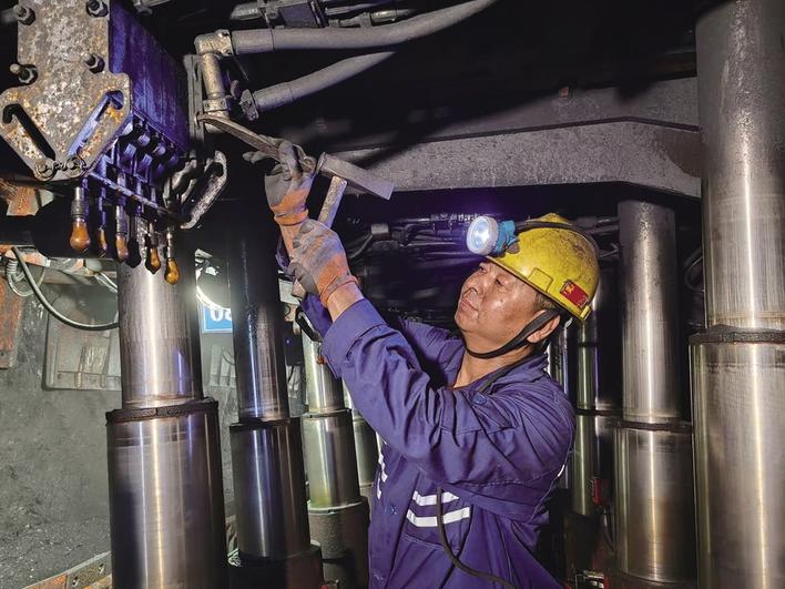峰峰集团九龙矿持续加大各类设备检修维护力度,严格落实“点检定修制”和日周月检制,扎实开展设备动态巡检,实行设备包保,全方位排查处理安全隐患,确保设备完好率和安全可靠运行。图为该矿职工在对工作面液压支架进行检修维护。 杜鹏龙 吴朝阳 摄