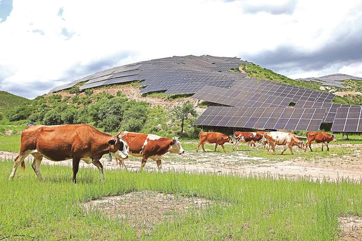 光伏产业同样发展迅速,除了大规模建设集中式光伏发电项目外,尚义县还结合休耕种草、察汗淖尔流域保护修复等规划,探索建设牧光互补项目,拓展光伏开发空间。据了解,仅尚义400兆瓦牧光互补光伏项目,每年预计可发绿电约6亿度,相比火力电发,年节约标煤约25万吨,年减排二氧化碳约60万吨。同时,光伏电场建设能起到遮阴、防风、固沙,减少水分蒸发等作用,草场内,牛羊的粪便又成为天然肥料,滋养着土地,使整个生态环境朝着良性方向发展。