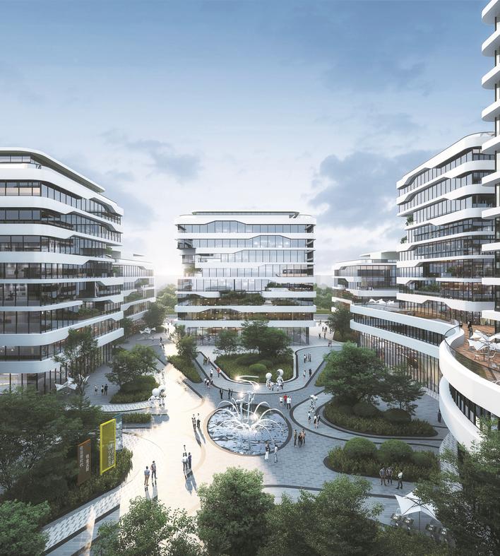 项目以“生产、生态、生活”产城融合发展为理念,将数字金融科技元素与第四代建筑生态理念巧妙融合,打造智慧、开放的第四代科技生态园区,共计规划建设14栋楼,南区为花园式科创企业微总部,北区为多层生态研发办公、科技龙头企业总部基地。园区为开放式智慧园区,采用人车分流的动线设计。项目西南区域为公建市政地上停车场,园区北区规划地下停车场。建筑设计采用第四代立体花园设计;外立面采用半透LOW-E玻璃加奢白铝板+360度环幕落地窗;景观设计以智能生态绿谷理念,规划“两个中心景观庭院”,满足产业研发办公人员休闲、社交需求。