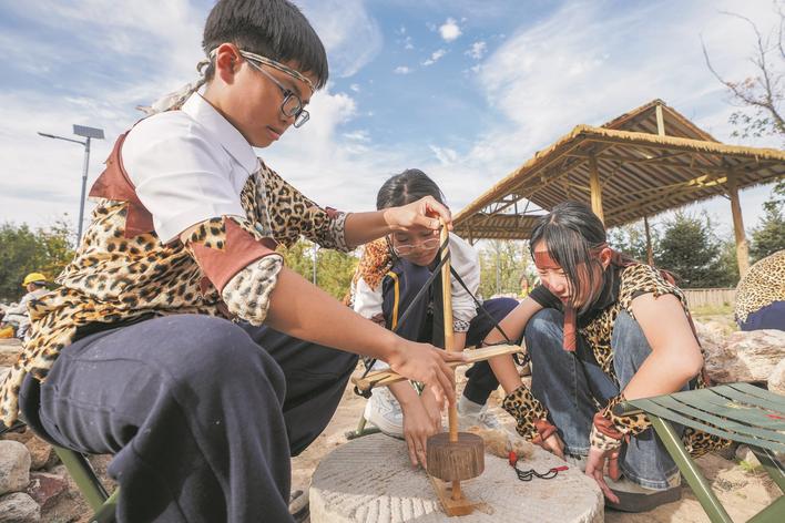 溯源步道上,学生在导师的讲解中走进《从猿到人:我们的神奇变身记》课程,通过观察遗址点位与猿、人雕塑,梳理人类演化的关键节点;而在远古部落区域,研学体验更具挑战性,学生跟随导师体验钻木取火,亲手尝试点燃“远古火种”,还可以参与《打制石器》课程,学习制作原始工具,也可以在导师的带领下开启《考古发掘》实践,过上一把“小小考古学家”的瘾。实践课程结束后,稳步去参观小长梁遗址,亲身领略泥河湾独特的地层风貌,感受地质与文明交织的厚重底蕴。