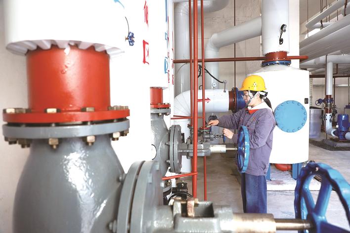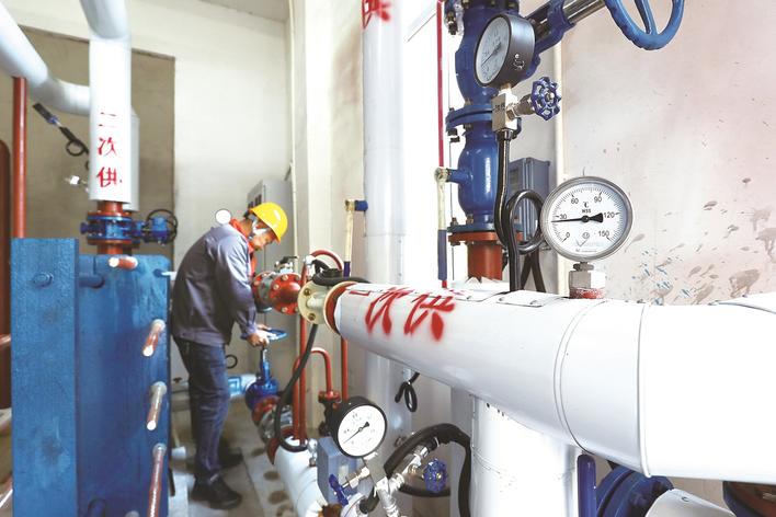 工作人员在监测供热系统注水施压运行情况。