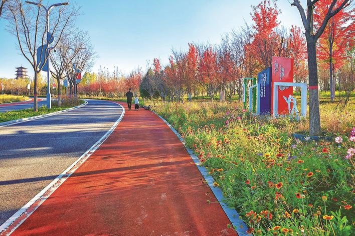 秋意渐浓,唐山花海景区美如画卷,吸引众多市民来此休闲游玩。图为市民在唐山花海跑步,尽享金秋美景。何川 摄