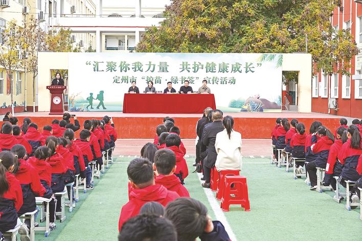 10月20日,定州市中心实验小学里暖意融融,2025年“护苗・绿书签”宣传活动在此开展。230余名师生代表齐聚,共同投身这场守护未成年人健康成长的暖心行动。 长城网·冀云客户端记者 赵绅光 摄