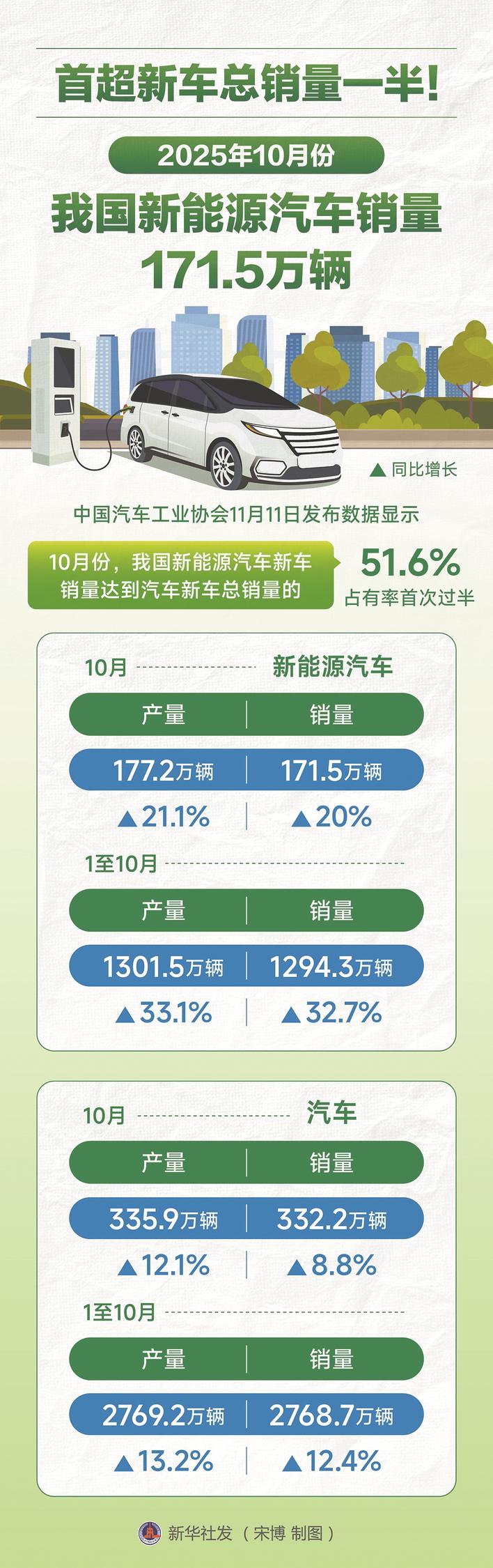 新华社北京11月11日电(记者唐诗凝)中国汽车工业协会11月11日发布数据显示,2025年10月份,我国新能源汽车产销同比保持快速增长,新能源汽车新车销量达到汽车新车总销量的51.6%,占有率首次过半。