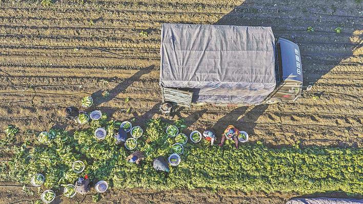 近日,唐山市玉田县虹桥镇农民在田间将冬储大白菜装车外运(无人机照片)。各地农民抢抓农时,有序开展冬季农业生产。